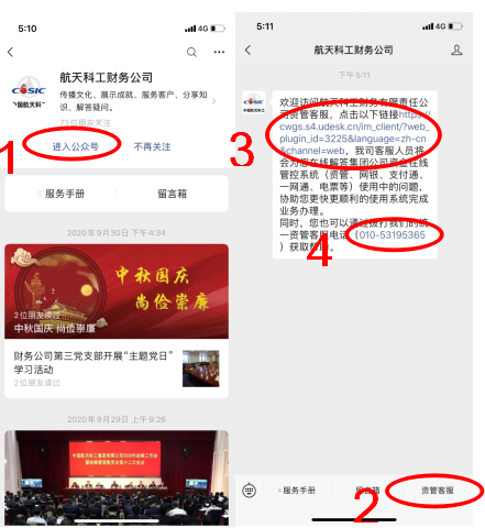 别担心,现在您只需要关注我司微信公众号“航天科工财务公司”,点击“资管客服”按钮,通过在线交流解决资管系统使用过程中的问题。具体操作流程如下: